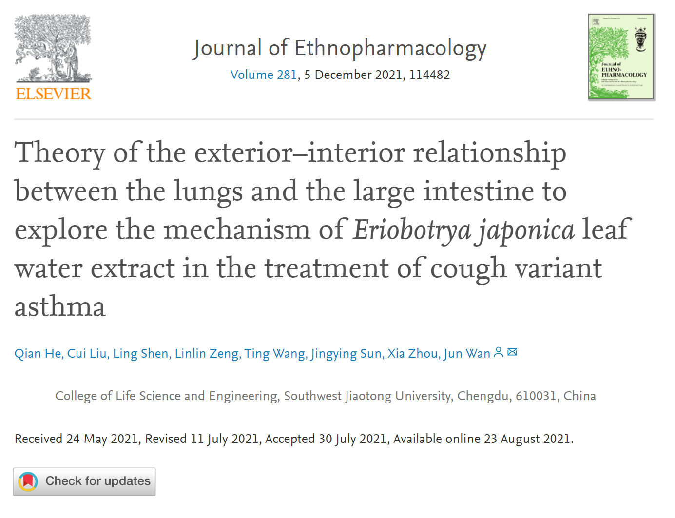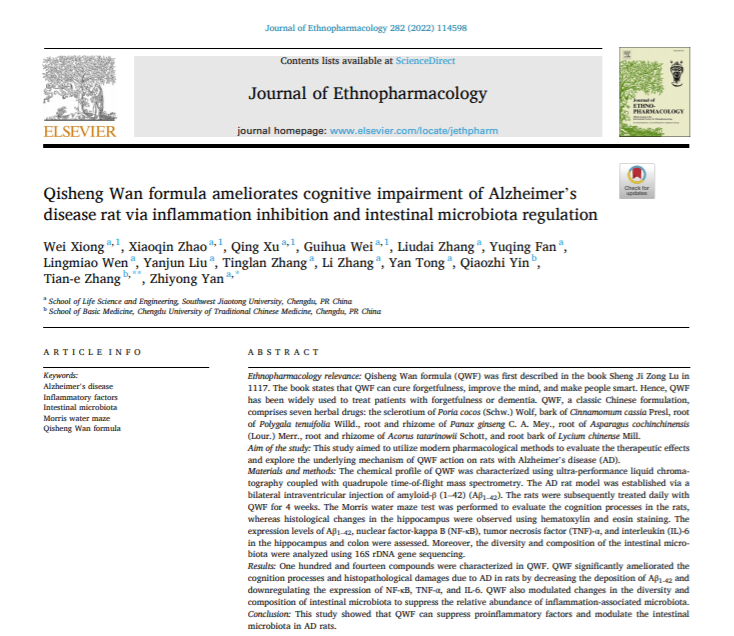 正妹av 闫智勇教授课题组在中药药理学权威期刊《JOURNAL OF ETHNOPHARMACOLOGY》上发表高水平论文