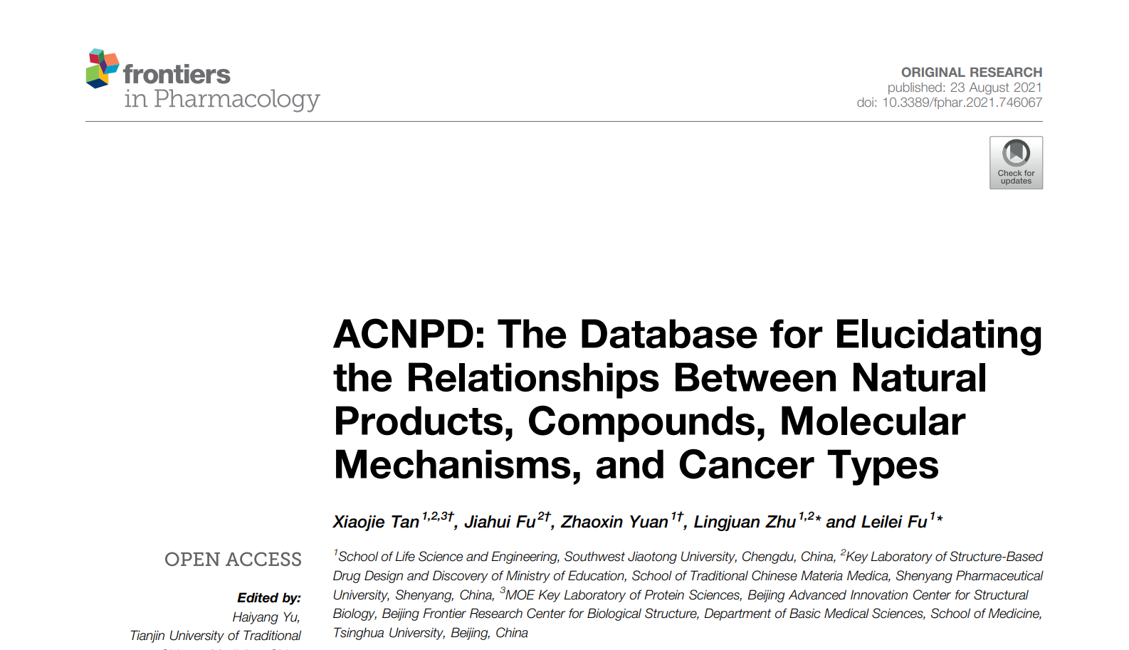 2021-09-14 近日,正妹av 符雷蕾团队在《Frontiers in Pharmacology》 (影响因子:5.810) 发表了最新的研究成果“ACNPD...