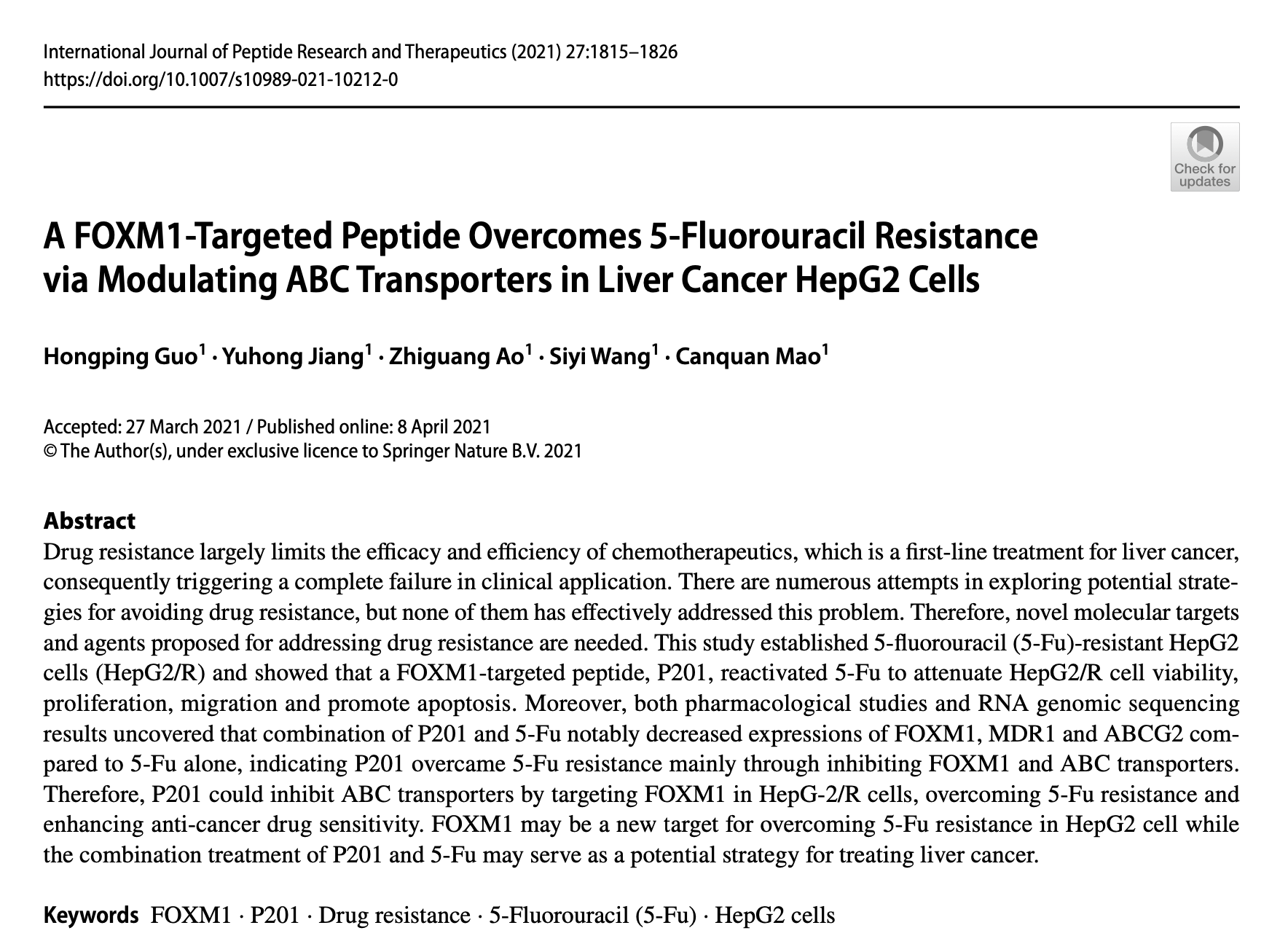 2021-11-01FoxM1转录因子在多种癌症的发生、发展及转移中有着重要的作用,被认为是癌症的致命伤(Achilles’ heel)。茆灿泉教授研究团队自2007年...
