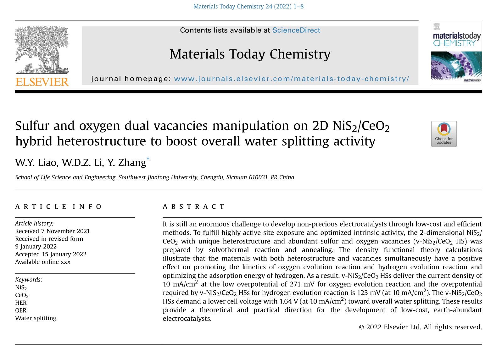 正妹av 张颜老师在化学领域TOP期刊Materials Today Chemistry发表最新研究成果